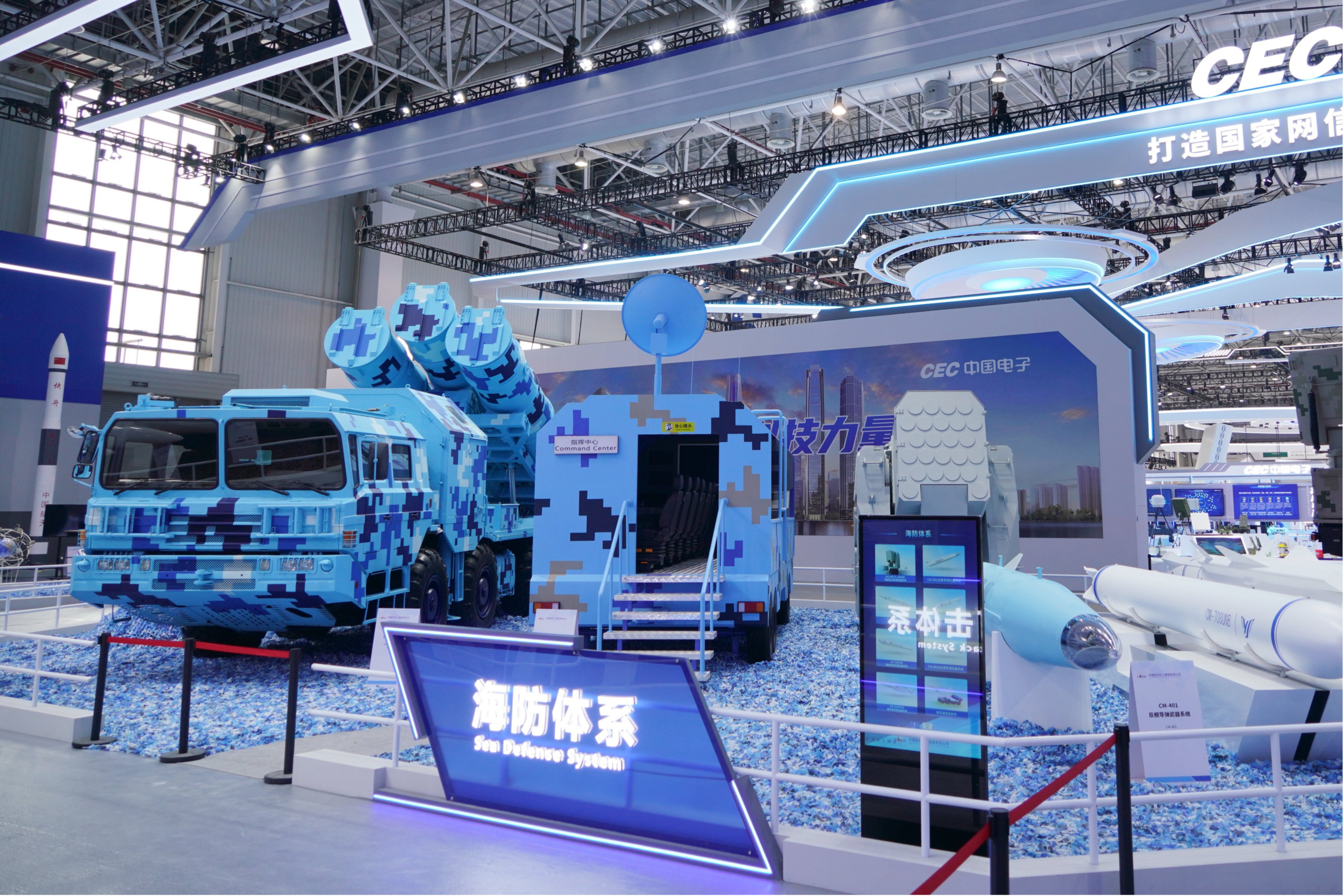 信息化條件下的現代戰爭不僅是武器系統之間的火力比拼,更是體系與體系的對抗。本次展出的海防體系由指揮控制系統、預警探測系統、火力打擊、通信系統和保障系統組成,將各種高性能的海防利器通過信息化手段組成一個互聯互通、相互配合的打擊體系,能夠提供遠、中、近程全方位的對海防御解決方案。
