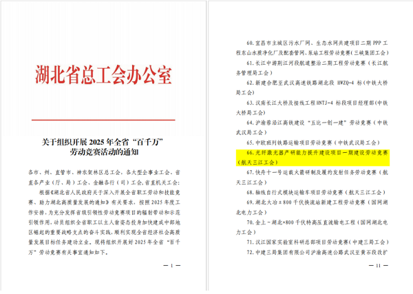 近日,湖北省總工會辦公室印發(fā)《關(guān)于組織開展2025年全省“百千萬”勞動競賽活動的通知》,公布2025年度全省“百項引領(lǐng)性重點工程勞動競賽項目”名單,銳科激光憑借“光纖激光器產(chǎn)研能力提升建設(shè)項目一期建設(shè)”項目成功入選。這是繼2023年后,銳科激光再次躋身省級重點工程勞動競賽行列,進一步彰顯公司在推動技術(shù)研發(fā)、產(chǎn)業(yè)升級與產(chǎn)業(yè)工人隊伍建設(shè)改革工作中的引領(lǐng)地位?。