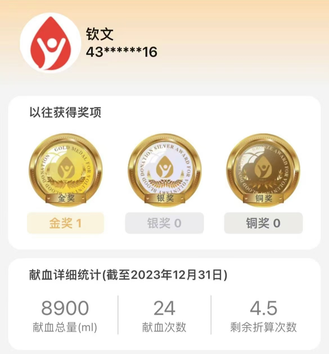 “那是第一次獻血。但想到獻血可以救人,感到很神圣,也就沒有那么害怕了?!睔J文告訴我們,此后的每一年他都會參與獻血。至今欽文已累計獻全血5次,成分血19次,獻血總量8900ml。他也因此榮獲“全國無償獻血奉獻獎金獎”。